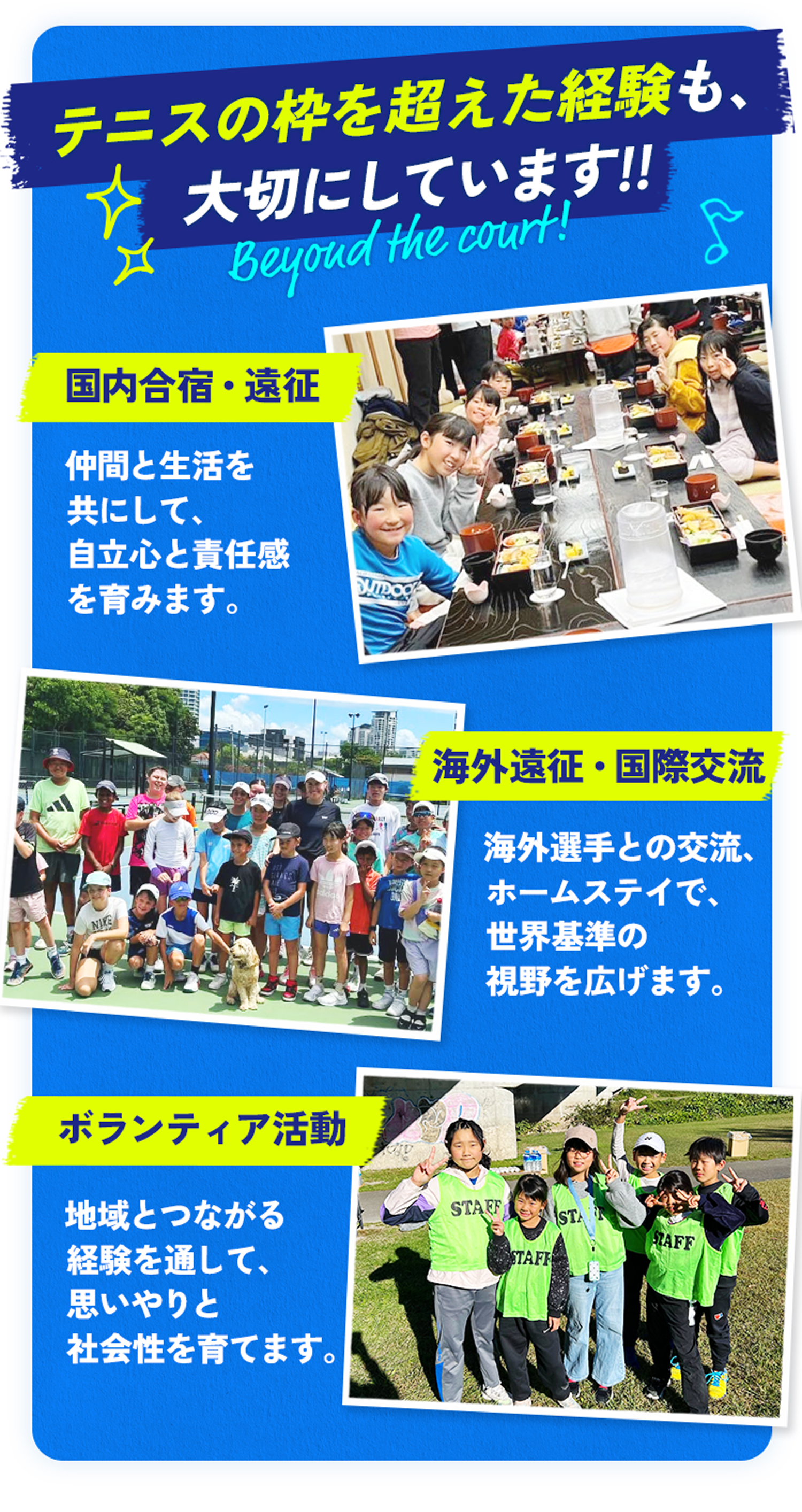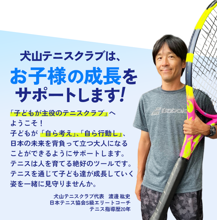 コーチはテニスだけでなく、さまざまな分野に精通していて、学校での出来事や家庭での悩みまで相談できます。また、子どもの存在をきちんとリスペクトし、大人よりも子どものほうが優れている面が多いことを理解したうえで接してくれているのが伝わってきます。