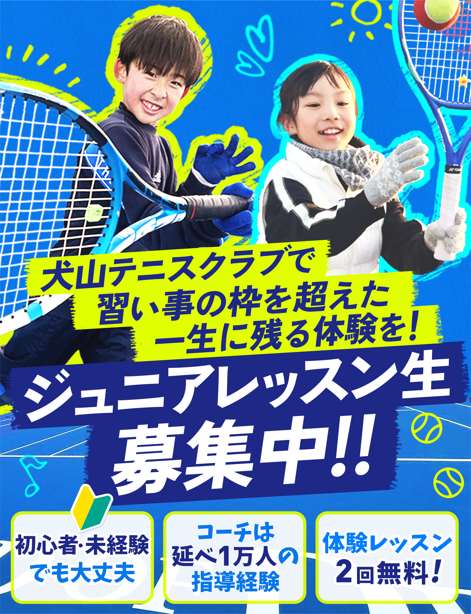 犬山テニスクラブでは、体験レッスンを2回まで無料で受講できます。 1回だけでは分からない、レッスンの雰囲気、コーチとの相性、お子様自身の「楽しい」「やってみたい」という気持ち を、実際に体験しながら確かめていただけます。無理な勧誘はありませんので、安心してご参加ください。