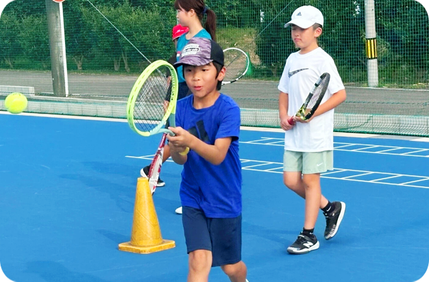 犬山テニスクラブでは、テニスが初めてのお子様や、運動が少し苦手なお子様でも、安心して始められる指導を行っています。ラケットの持ち方や構え方など、基礎の「き」から丁寧にサポート。 一人ひとりの成長スピードに合わせて進めるので、 「ついていけない」「できなくて嫌になる」といった心配はありません。
